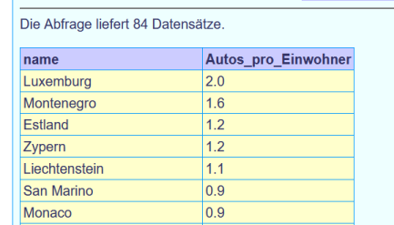 - Zeige für jedes Land die Anzahl PKW je Einwohner, geordnet nach der berechneten Größe.